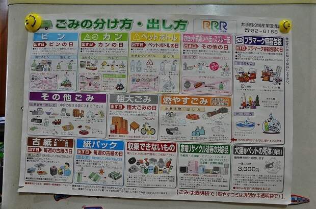 Расписание, когда и какой мусор выбрасывать. Например, старую мебель вы не можете просто так оттащить к мусорному баку, вы должны позвонить в мэрию и те приедут специально и заберут крупногабаритный мусор. Также, не каждый день вы можете выбрасывать стеклотару, а лишь 1-2 дня в неделю. Нарушите правила - вас оштрафуют, а соседи безусловно на вас донесут, что мол, этот гайдзин (иностранец) в неправильный день выбросил стеклотару в мусорку для бумаги