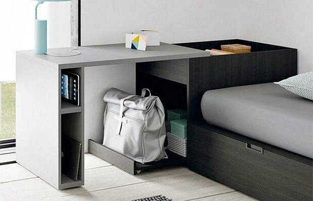 Современная модульная мебель создана для того, чтобы сделать быт людей, проживающих на маленькой площади, комфортнее. Этот стильный компактный столик на направляющих, установленный возле кровати, - яркое тому подтверждение. В сложенным виде столешница становится частью прикроватной тумбы, но стоит потянуть его на себя - он превратится в полноценный удобный рабочий стол.