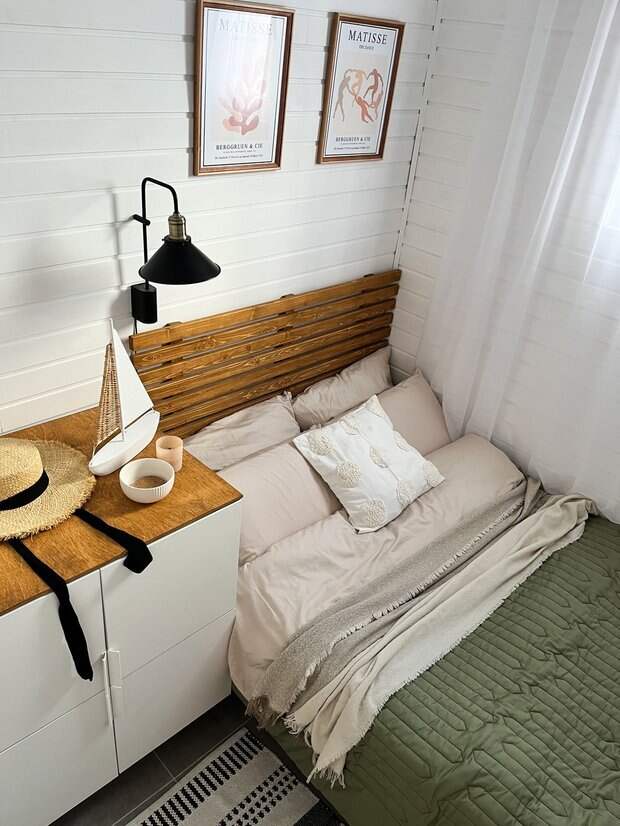 Кровать состоит из деревянного изголовья и металлического основания. Основание приобрели на маркетплейсе, а вот изголовье сделали сами. Купили в строительном магазине деревянные бруски, распилили под нужный размер, отшлифовали, пропитали дерево маслом, придав ему цвет. Получилось классное решение, которое можно легко воплотить.