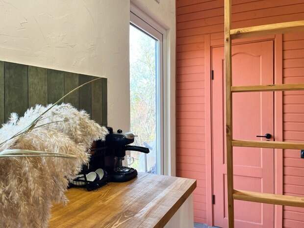 В гостиной есть две основные фишки. Во-первых, это второй этаж, где располагается спальное место. Лестница на второй этаж также сделана нами, еще она переносится в ванную комнату, но об этом расскажем дальше. Во-вторых, это двери в спальню и ванную. Мы купили обычные деревянные двери и покрасили их краской в цвет стен. Смотрится очень интересно и необычно, особенно в сочетании с черными дверными ручками и петлями.