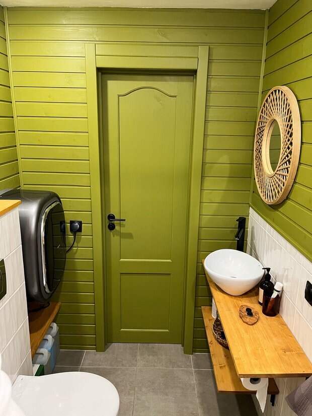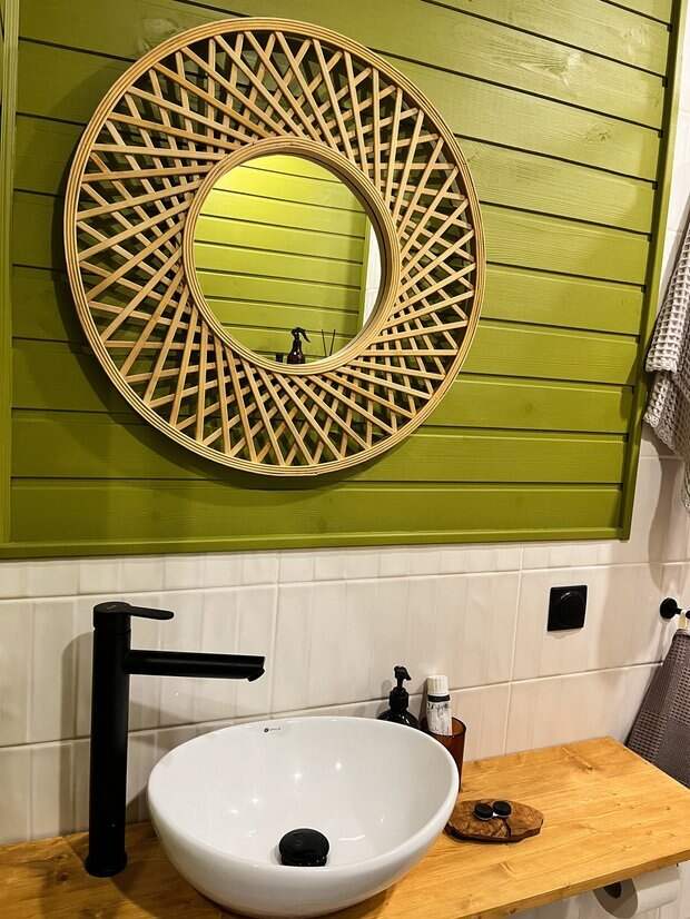 Из-за особенностей каркасного дома стены облицованы и плиткой, и вагонкой. Вагонку здесь мы покрывали специальной мебельной краской, чтобы защитить от большой влажности и воды.