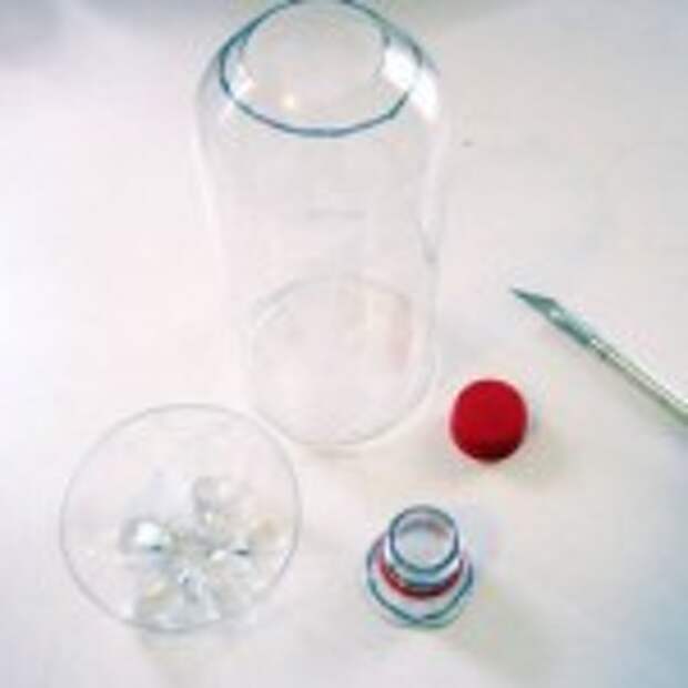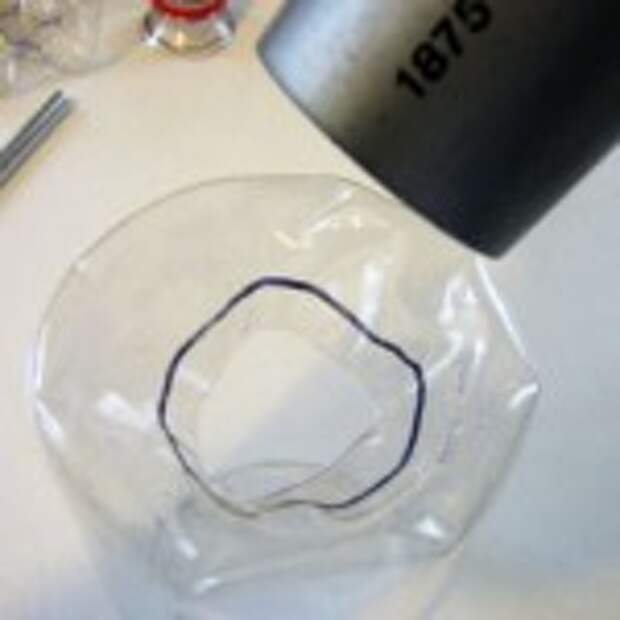 1. При помощи ножа срезать горлышко на бутылке, оставляя отверстие в верхней части горлышка бутылки,а также срезать дно.
